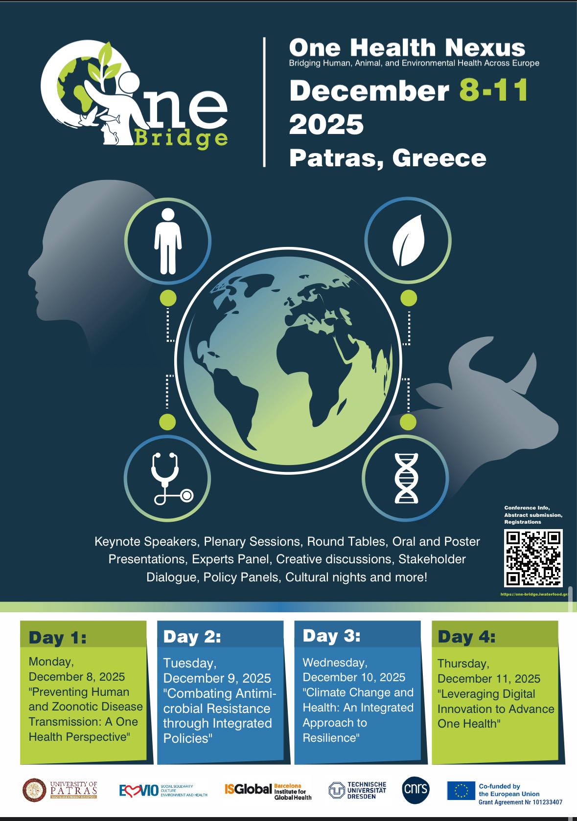 Το Εργαστήριο Υγιεινής, Επιδημιολογίας και Ποιότητας Ζωής της Ιατρικής Σχολής του Πανεπιστημίου Πατρών (Επιστημονικός Υπεύθυνος: Καθ. Απόστολος Βανταράκης)σας προσκαλεί στο Διεθνές Συνέδριο ONE-Bridge in Health το οποίο θα διεξαχθεί από τις 8 έως τις 11 Δεκεμβρίου 2025 στο Συνεδριακό και Πολιτιστικό Κέντρο του Πανεπιστημίου Πατρών, στο πλαίσιο του ευρωπαϊκού έργου EU4Health “One Health Nexus: Bridging Human, Animal & Environmental Health Across Europe”.