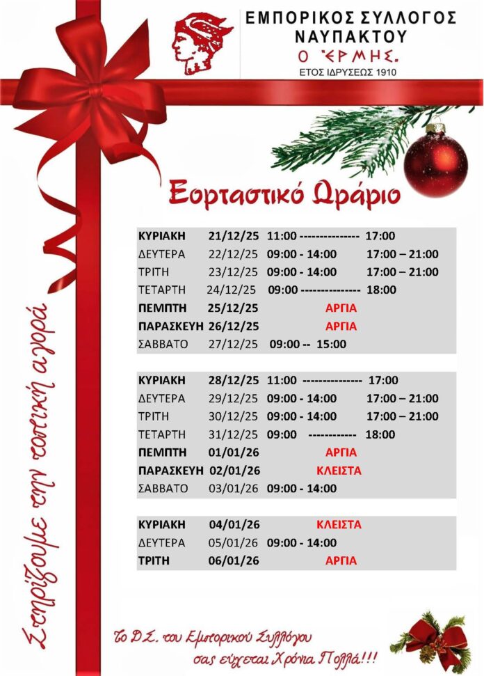 Το ΔΣ του Εμπορικού Συλλόγου Ναυπάκτου, ανακοινώνει το Εορταστικό Ωράριο των Εμπορικών καταστημάτων της Ναυπάκτου.